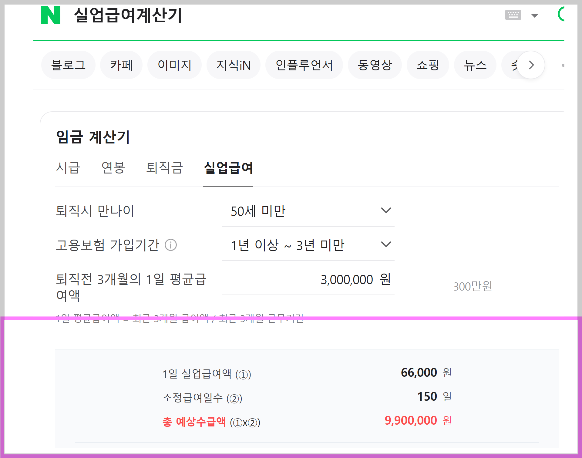 네이버에서도 실업금여 계산을 해볼 수 있습니다. 검색창에 실업급여 계산기 입력 후