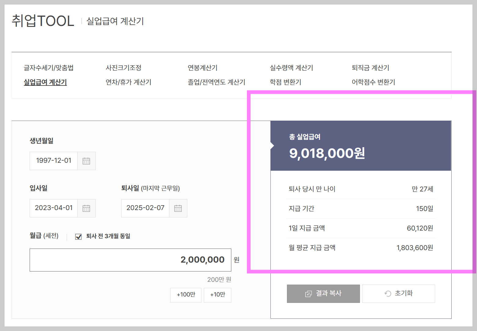 사람인 실업급여 계산기